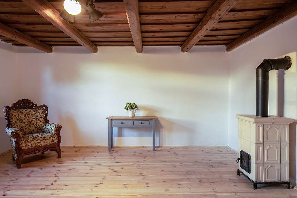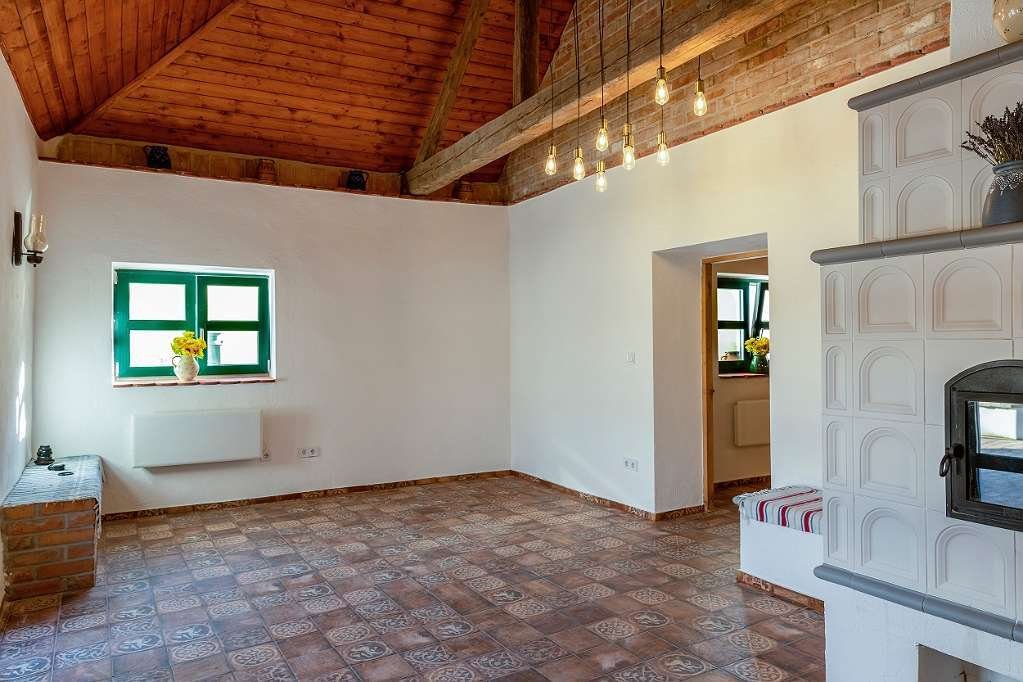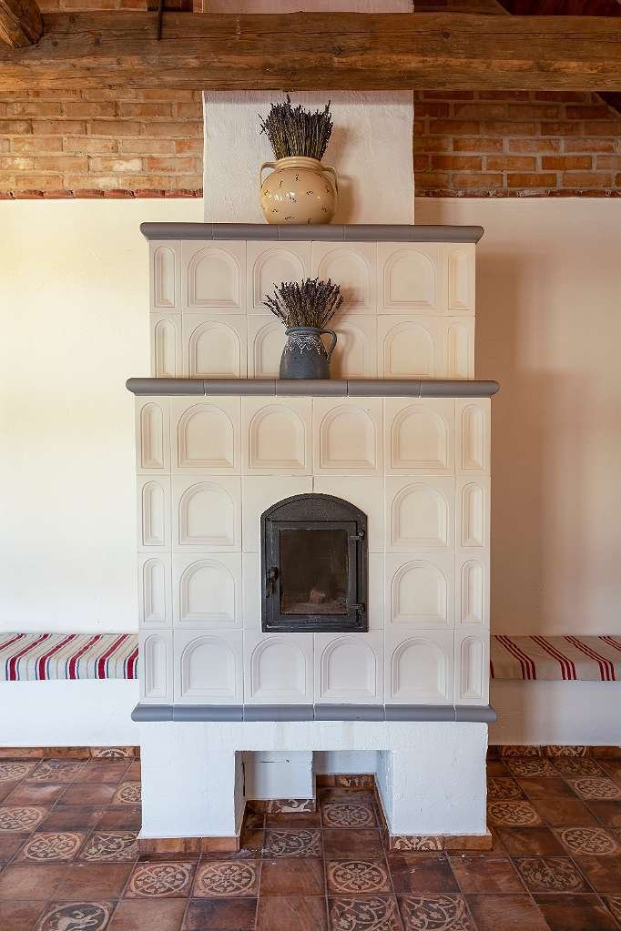 Nem kell törődnünk azzal, hogyan fűtsük be a szobát, amely akár nagy baráti társaságnak is elfér: egy hatalmas cserépkályha adja a meleget.