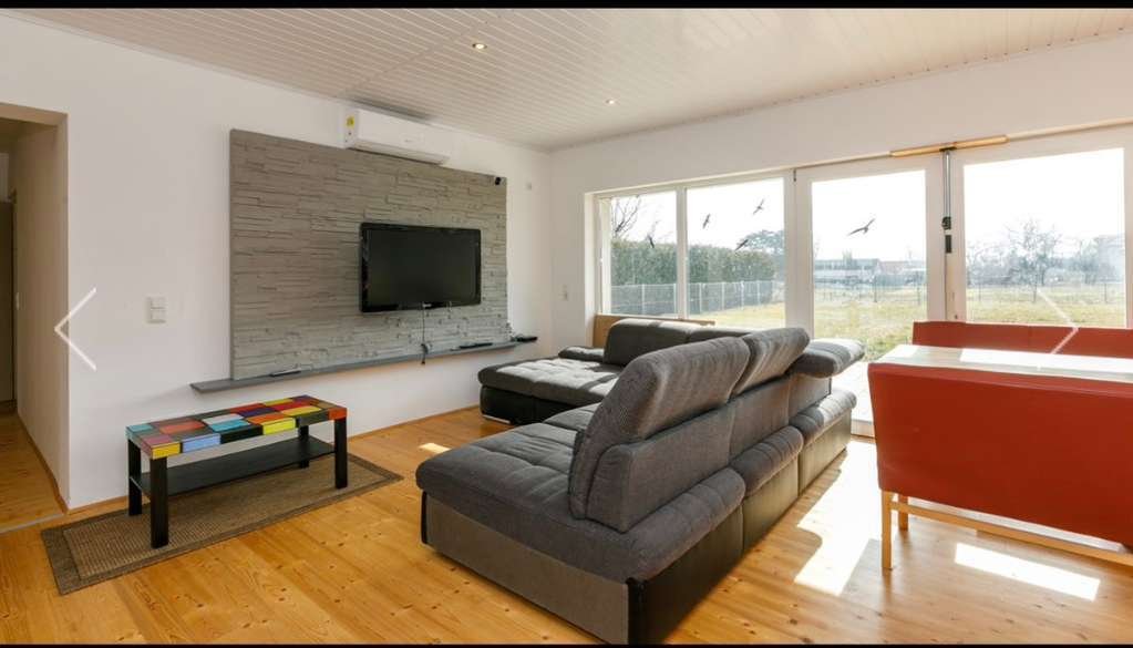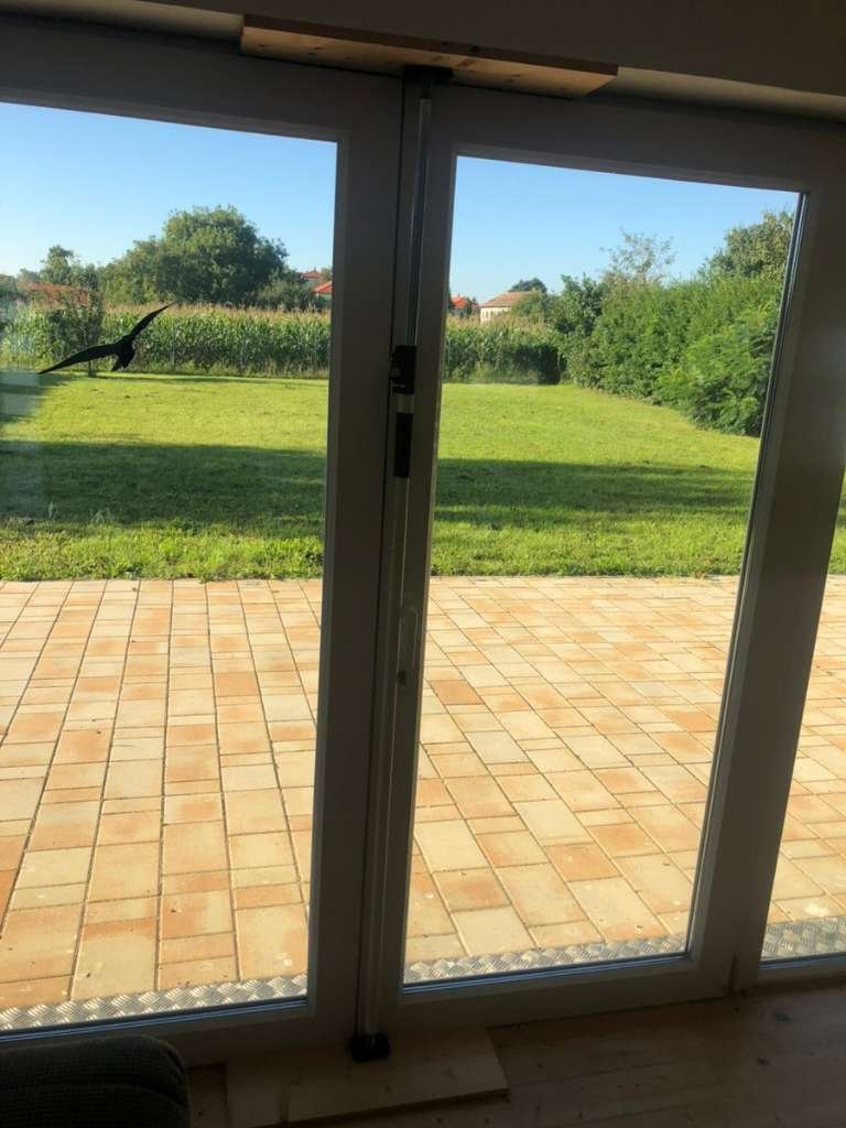 Télen a meleg szépen beáramlik a nappaliba a déli fekvésű üveghomlokzaton keresztül, mint egy télikertben. A fennmaradó homlokzati festést és a kültéri terület egy kis részét még a vevőnek kell elvégeznie.
