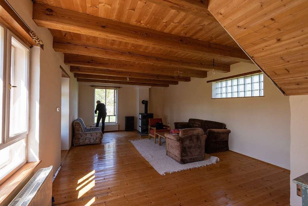 A konyhából az újonnan épült, téglából épült, kicsit lejjebb található tágas nappaliba jutunk (kb. 28 négyzetméter).
