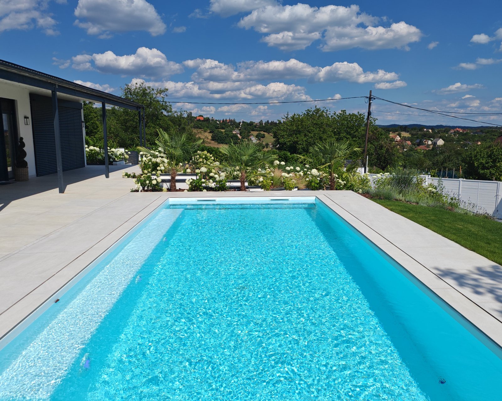 -10x4 m-es medence beépített elektromos fedéllel, paddal, világítással, automatikus sóregenerálással és pH-adagolással
