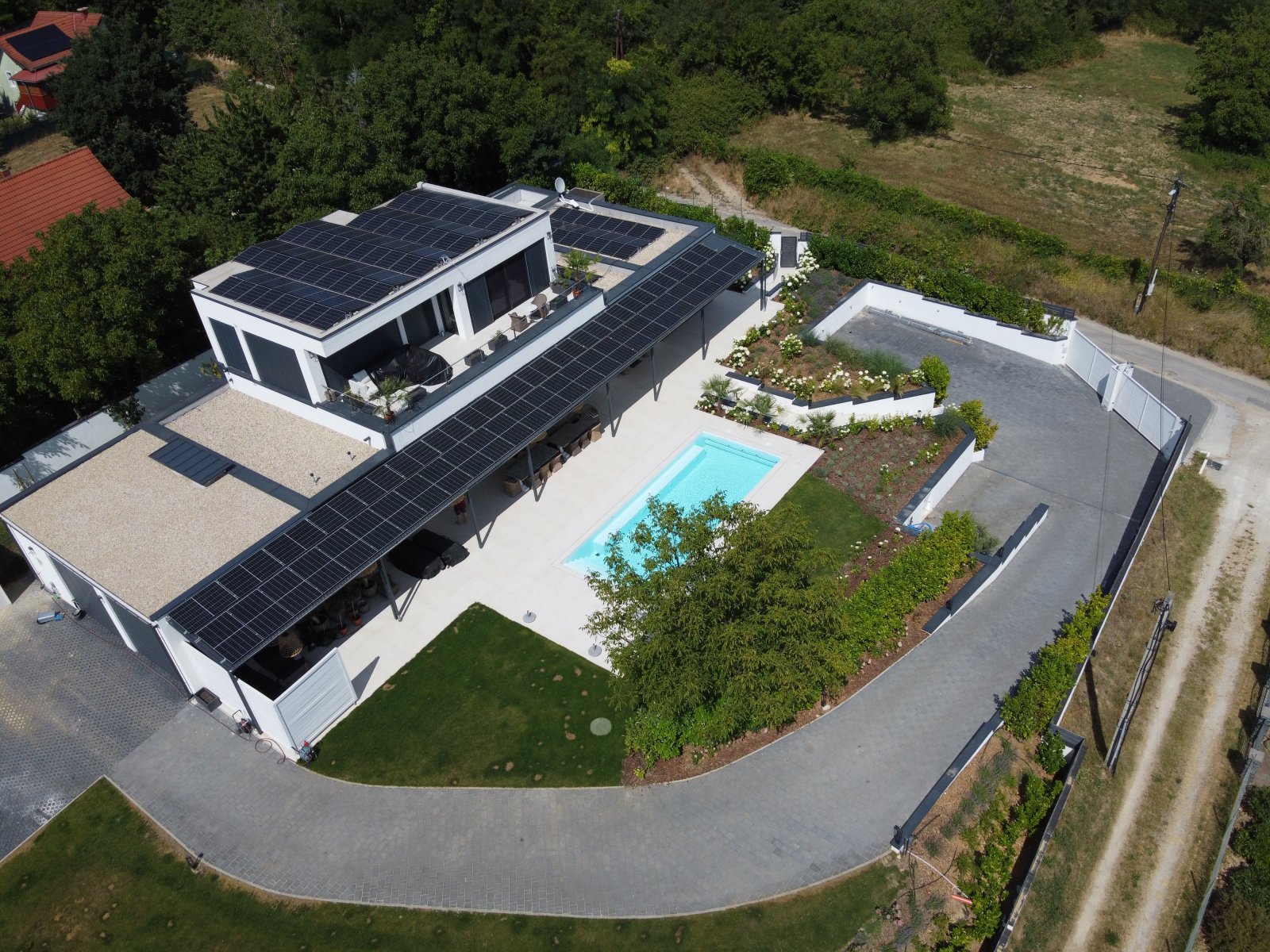 -Naplerendszer a teljes önellátásért, 2x20 kW-os 3 fázisú hibrid inverter, több mint 100 db 450 W-os (45 kWp) napelem, 80 kW-os nagyfeszültségű akkumulátoros tároló