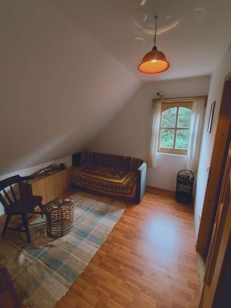 Az emeleten négy különálló hálószoba, fürdőszoba, WC és egy további szoba található. A ház fűtését a nappaliban található cserépkályha biztosítja, amelyet radiátorok egészítenek ki.