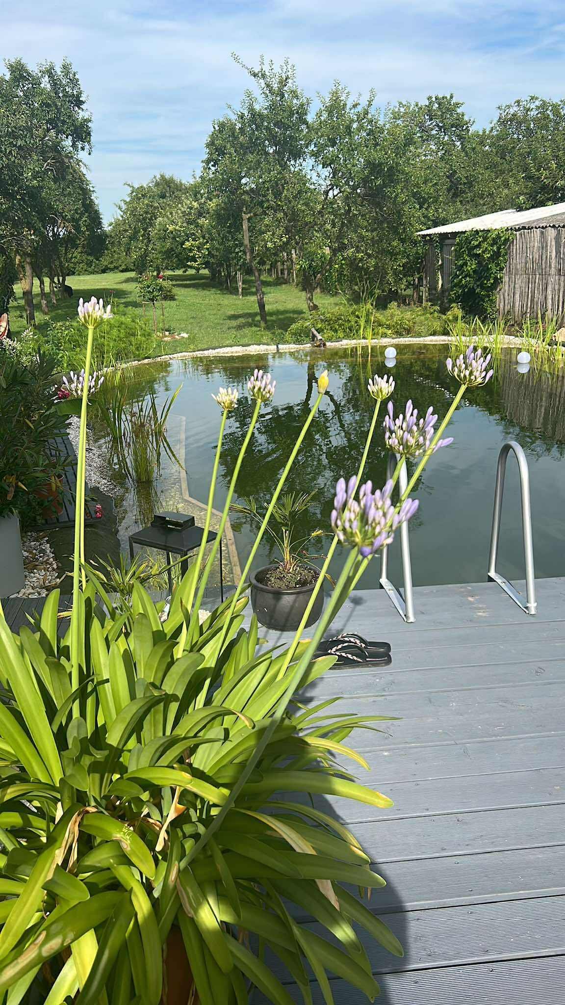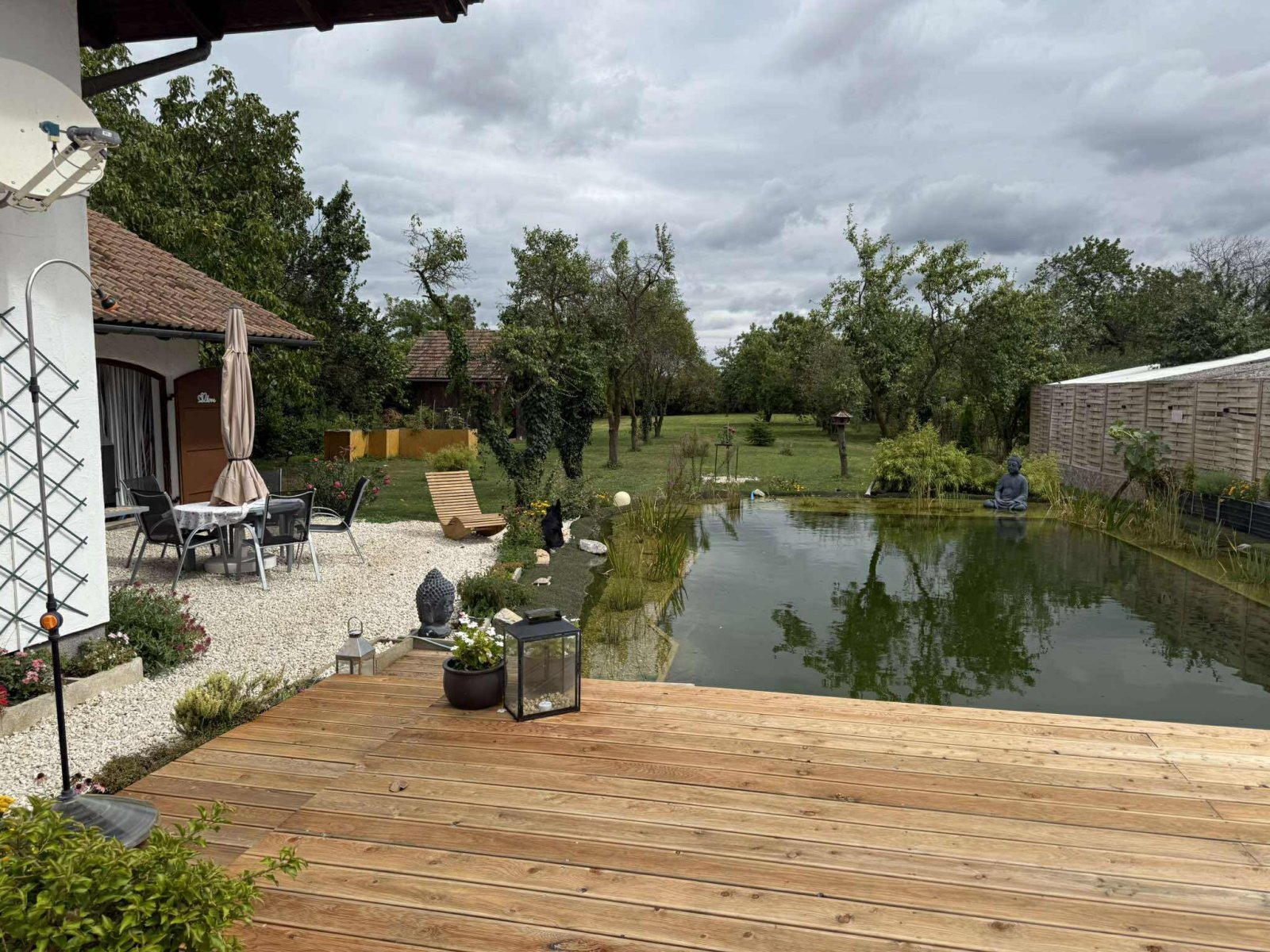 • Kerített, félreeső telek gyönyörűen parkosított kerttel, gyümölcsfákkal és egy nagy természetes medencével (12 x 6 m, átlátszó, biofilterrel)