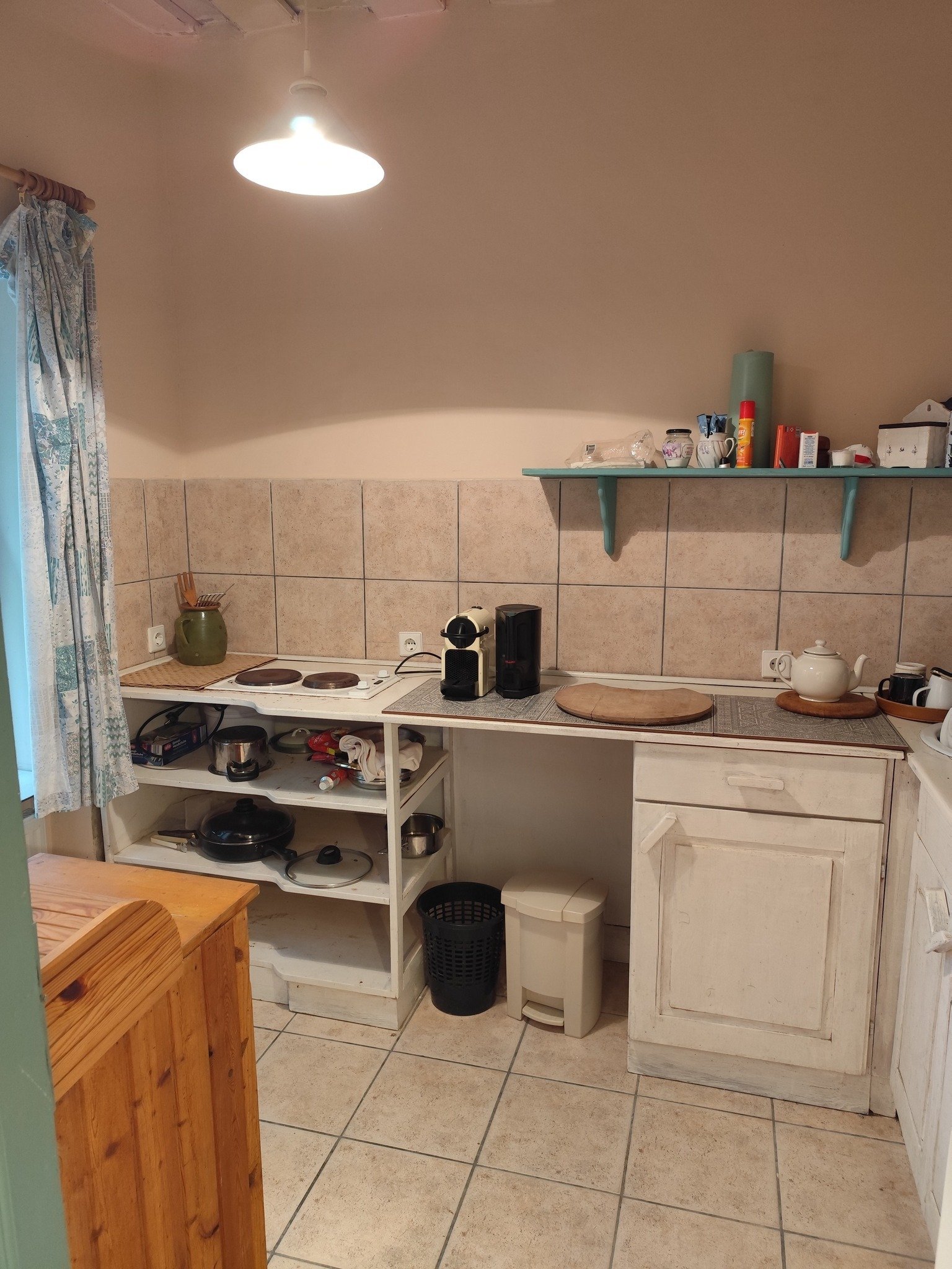 A konyhában megőrizték a hangulatos, hagyományos kályhát, amely igazi kincsként díszíti a szobát. Ez a gyönyörű kályha nemcsak praktikus funkciót tölt be, hanem a ház történelmét és kultúráját is megtestesíti.