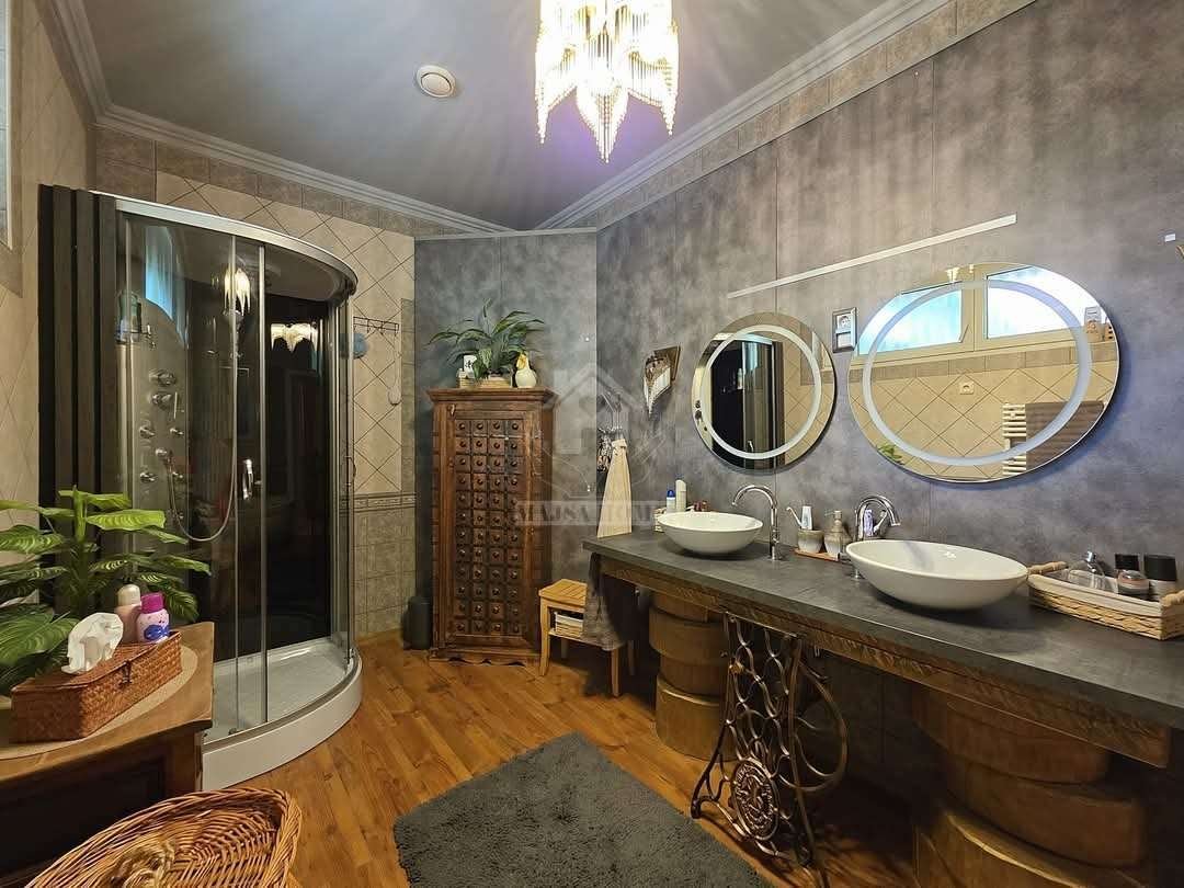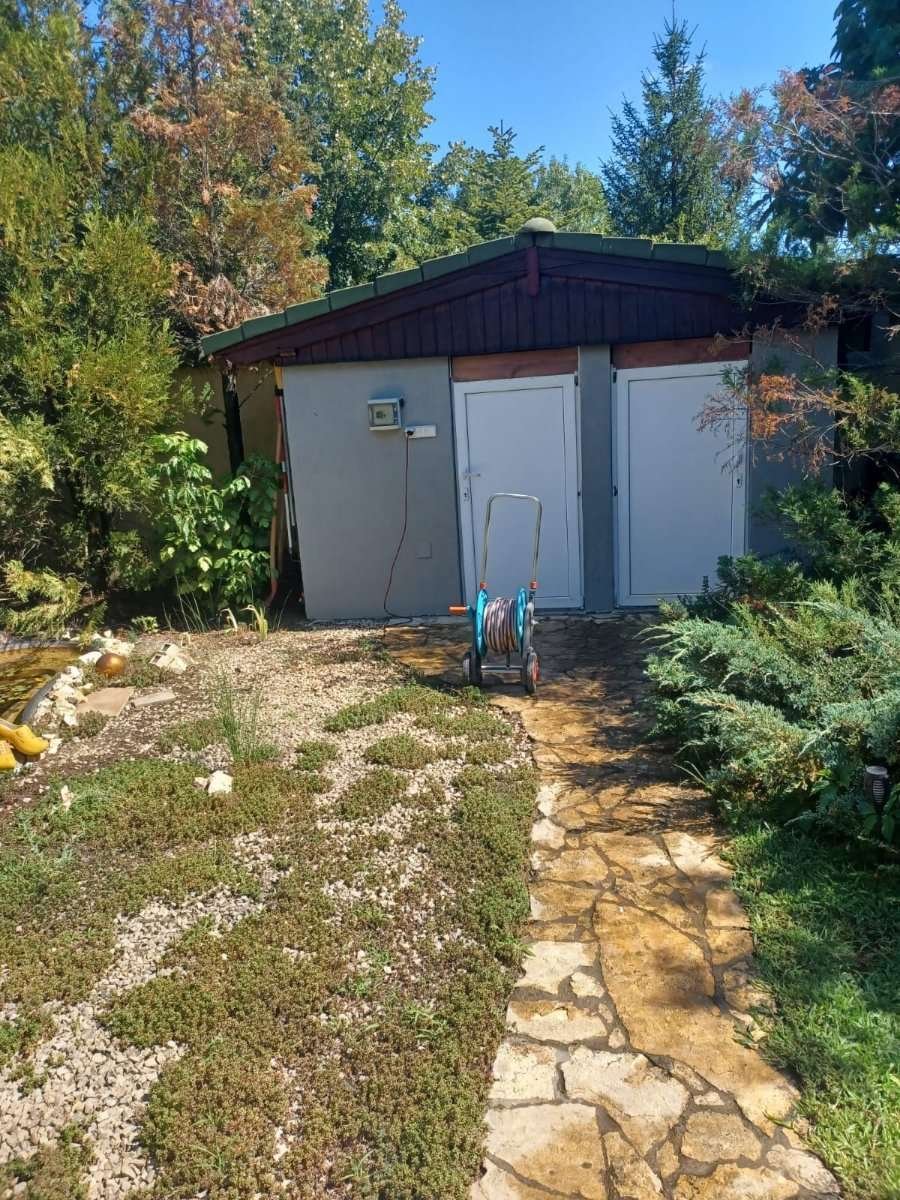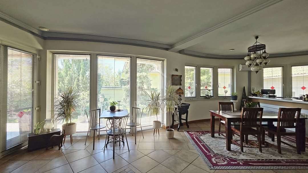 Az ingatlan 155 m² lakóteret kínál, előszobával, három hálószobával, dolgozószobával, nappali/étkezővel, konyhával, kamrával, fürdőszobával, WC-vel, gardróbszobával és háztartási helyiséggel. Ezen kívül található egy 45 m²-es garázs két parkolóhellyel és utcai bejárattal, egy 45 m²-es fedett terasz, valamint egy kétszobás melléképület az udvaron, amelyben a kerti medence közelében zuhanyzó és WC is található.