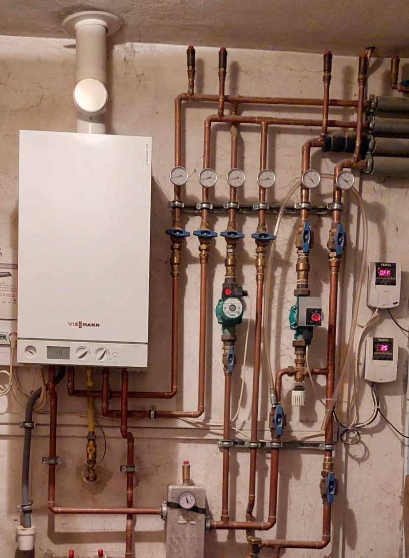 Gázfűtés + vegyes kazán 1000 literes puffertartállyal.