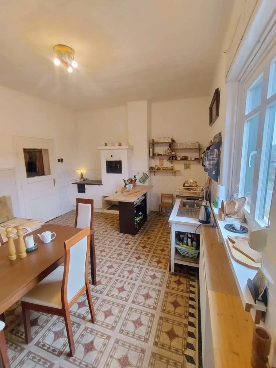 A konyhában egy kiváló állapotban megőrzött őrsegi fatüzelésű kályha található, amely tökéletesen működik.