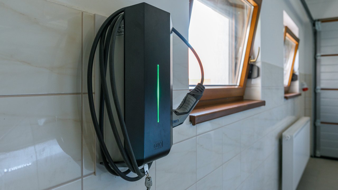 De woning beschikt over een dubbele garage met een laadstation voor elektrische auto's.