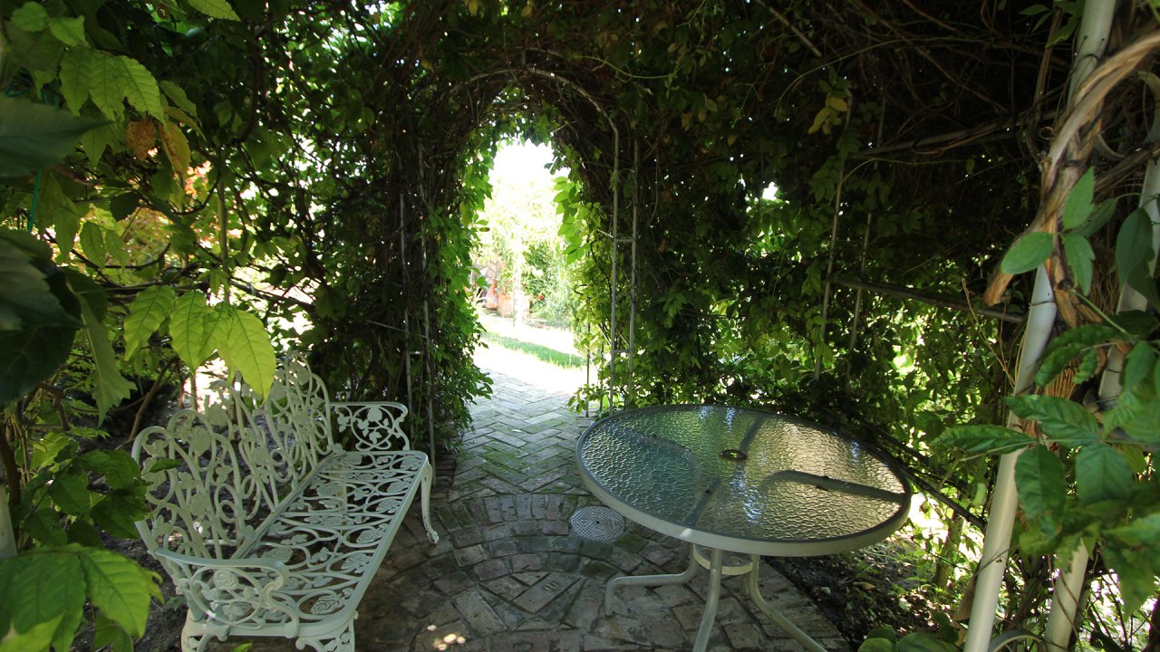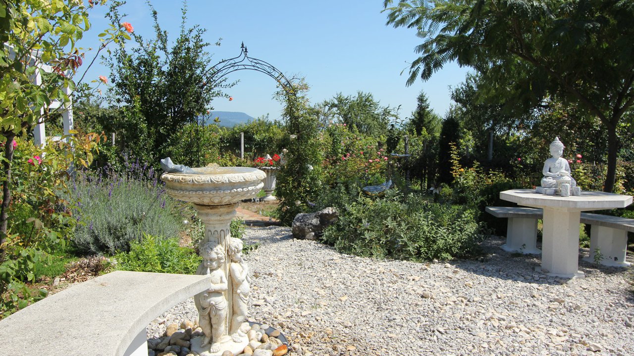 De tuin is een ware zeldzaamheid, vol bloemen, fonteinen en prieeltjes.
