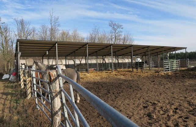 • Buitenstal van 32 x 8 meter met videobewaking en verstelbare panelen (momenteel in gebruik voor Hongaarse Grijze runderen en paarden)