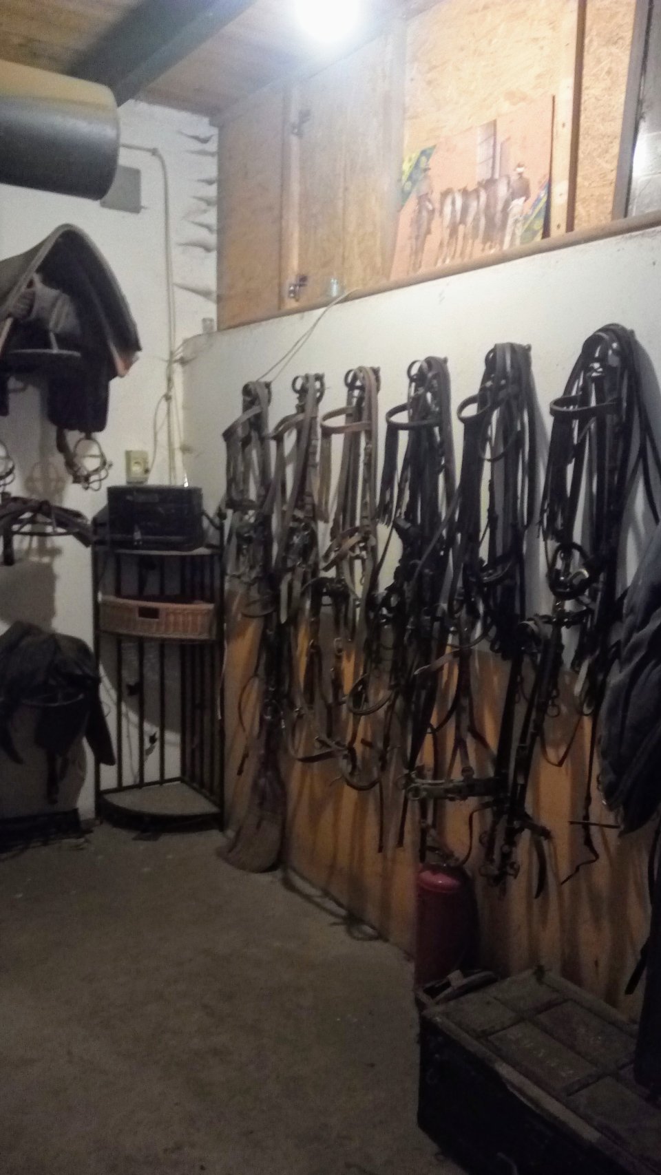 Stallengebouw ca. 280 m², met 5 boxen, zadelkamer, paardenwasplaats, extra doucheruimte met wastafel, houtkachel met ventilator voor de verwarming van de paardenstal en een aparte grote studio/werkplaats met 230/380 V elektriciteit.