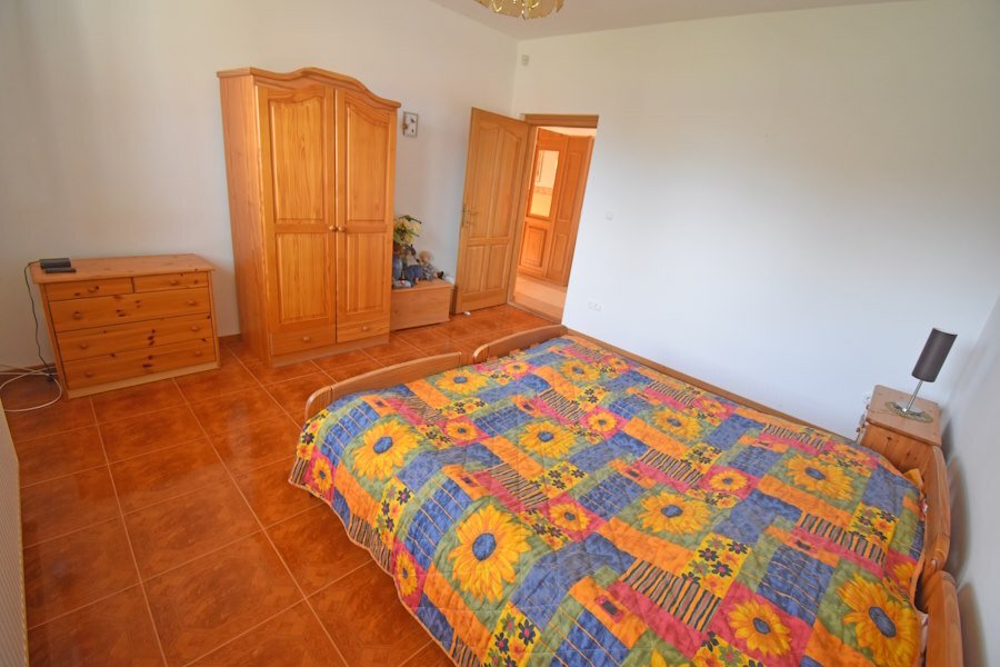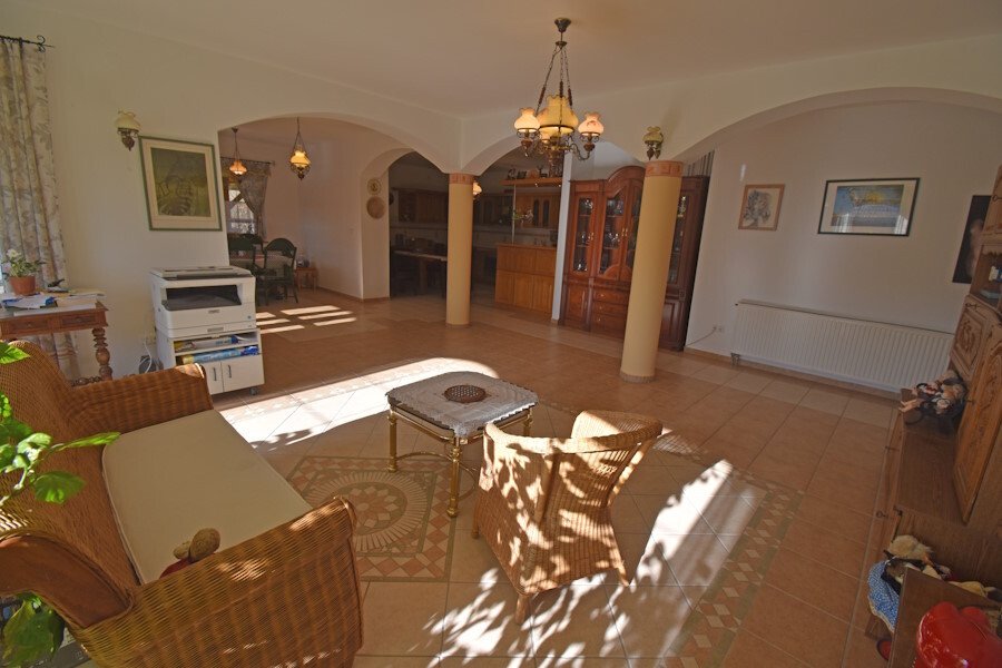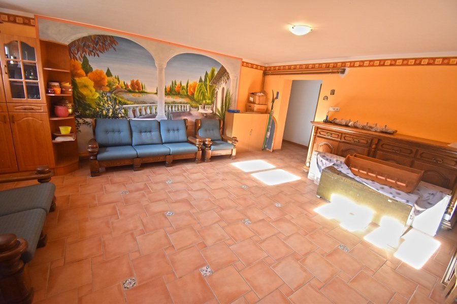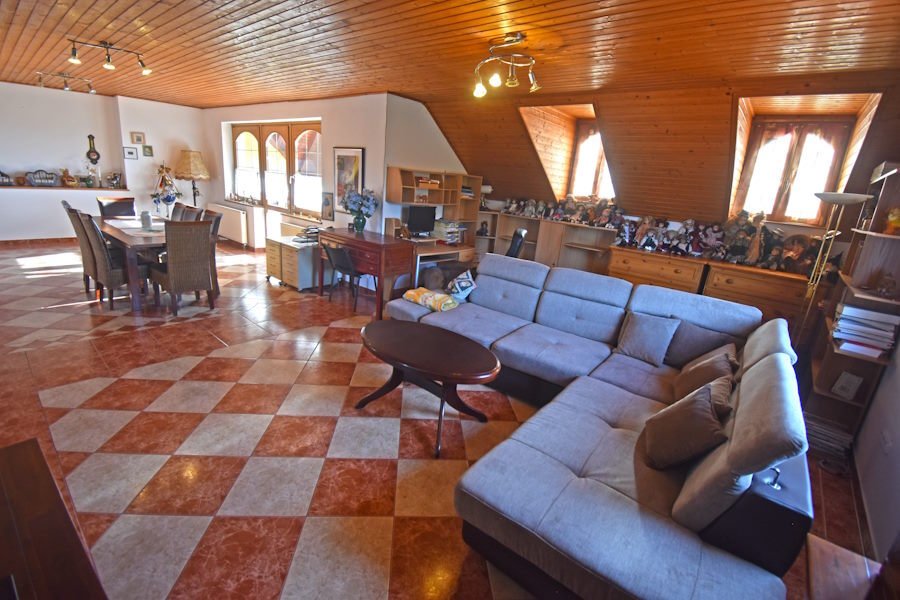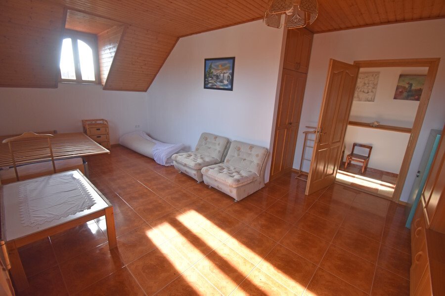 De begane grond heeft twee ingangen, waarvan één toegankelijk is vanaf de straat en een terras van 6 m² heeft. Vanuit hier opent de hal zich direct aan de linkerkant, van waaruit u direct de bovenverdieping kunt betreden. Twee kamers komen uit op de gang. Aan het einde van de gang bevinden zich een apart toilet en een ruime badkamer met bad, douche, toilet en bidet. Aan het einde van de gang, aan de linkerkant, bevindt zich een enorme woonkamer met een keuken, eetkamer en een ontspanningsruimte. De pantry is vanuit de keuken bereikbaar. Het L-vormige terras van 20 m², verbonden met de woonkamer, leidt naar de tuin.