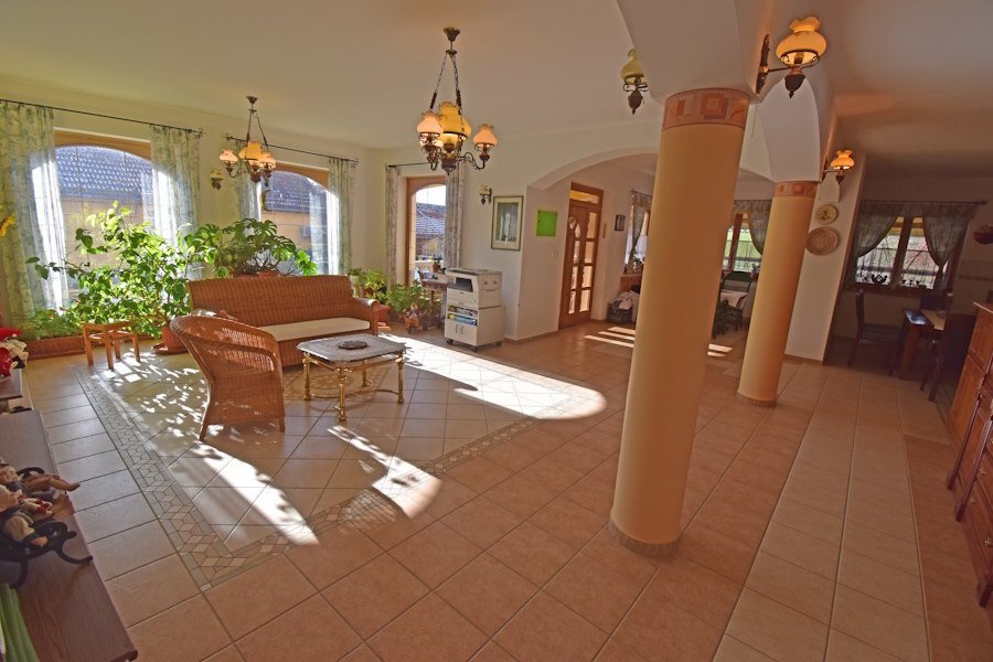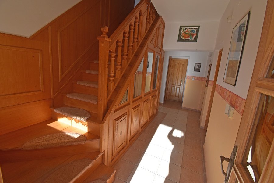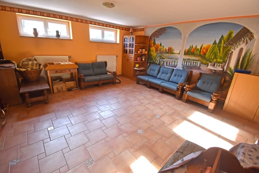 De entreehal op de begane grond leidt naar de kelder van 150 m², voorzien van dubbele bakstenen muren en isolatie. Deze omvat de stookruimte, een houtopslag van 12 m², een wasruimte die kan worden omgebouwd tot een gewone keuken, vier bergingen, een doucheruimte, een apart toilet en de trap. Afhankelijk van de individuele wensen kan deze verdieping worden ingericht als een apart appartement.