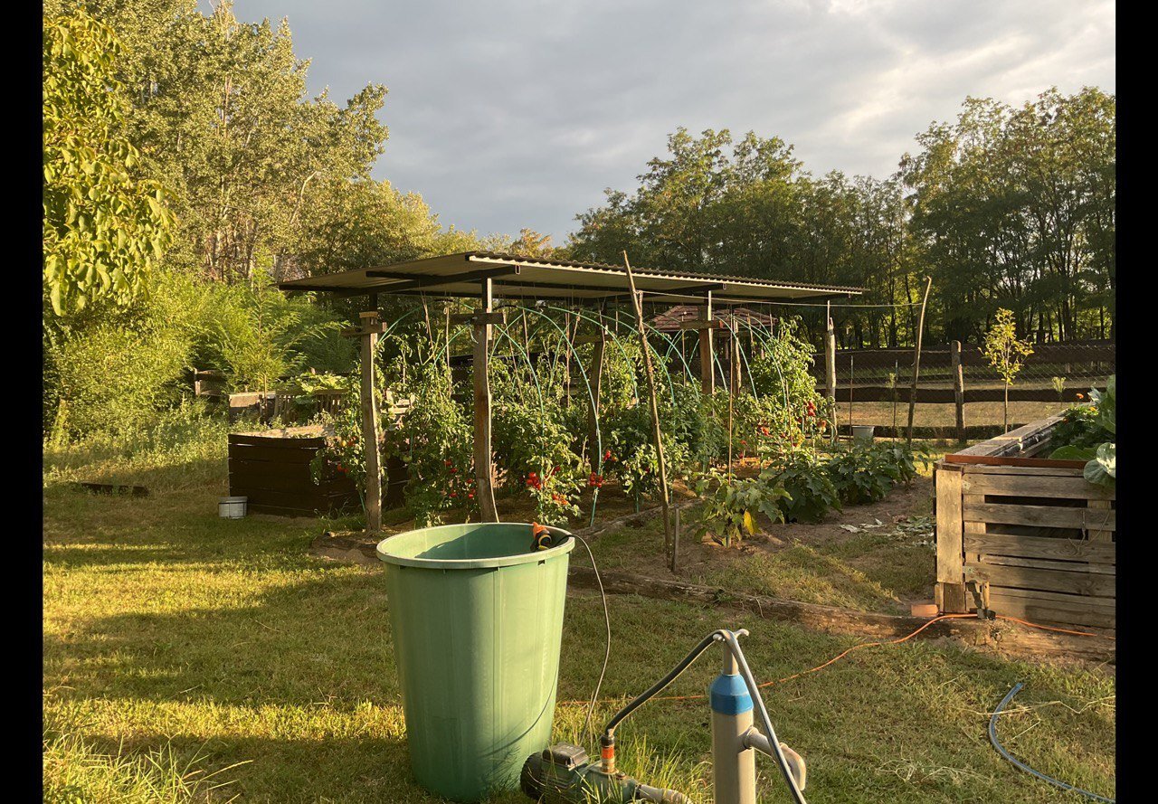 Hier vindt u de hoogwaardige glazen kas van 18 m², verhoogde en volle grondbedden, een kleine opslagruimte en het zonnesysteem voor Huis 1..