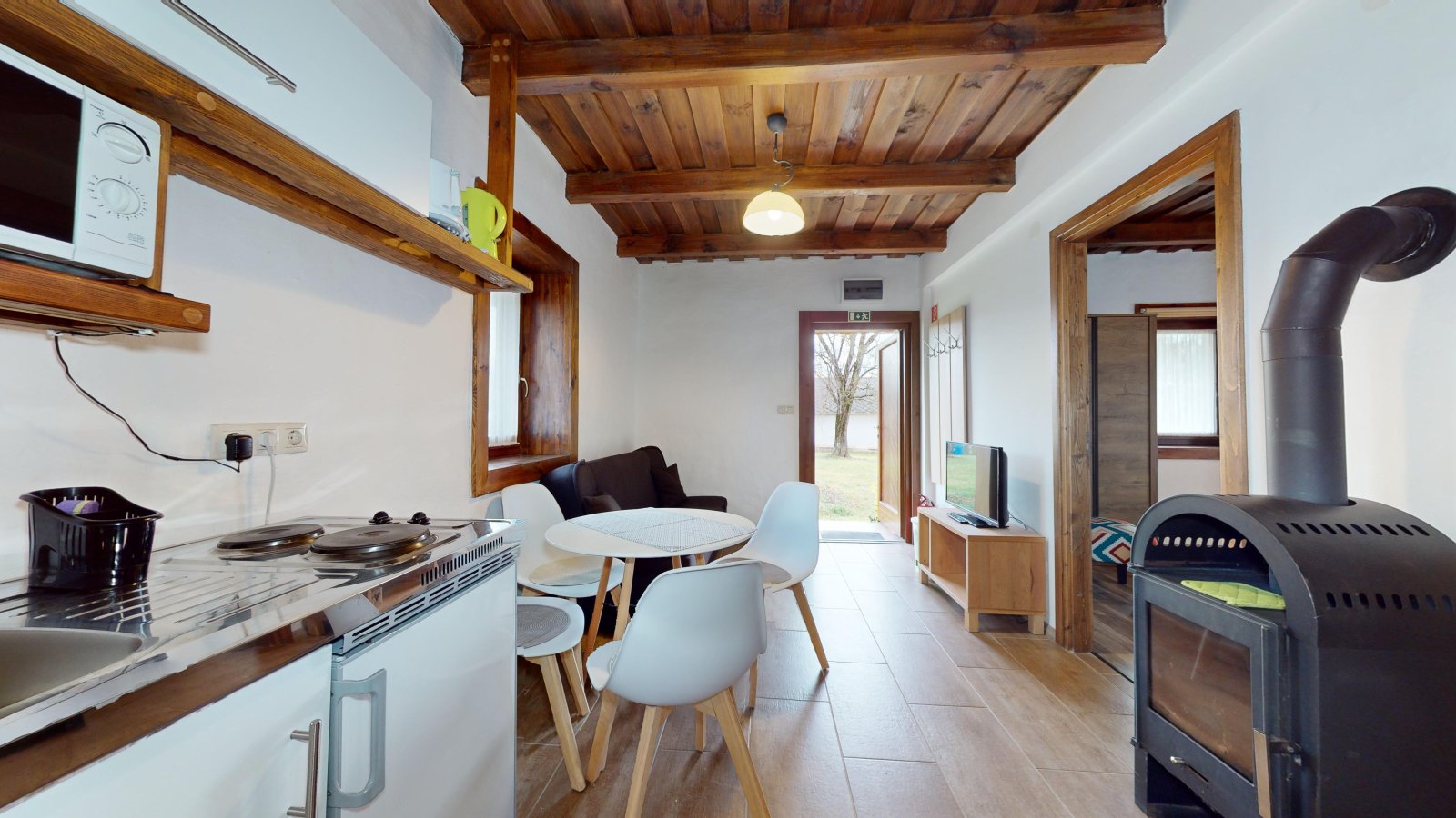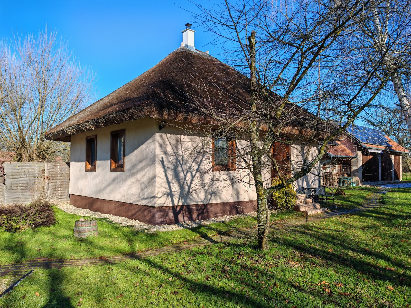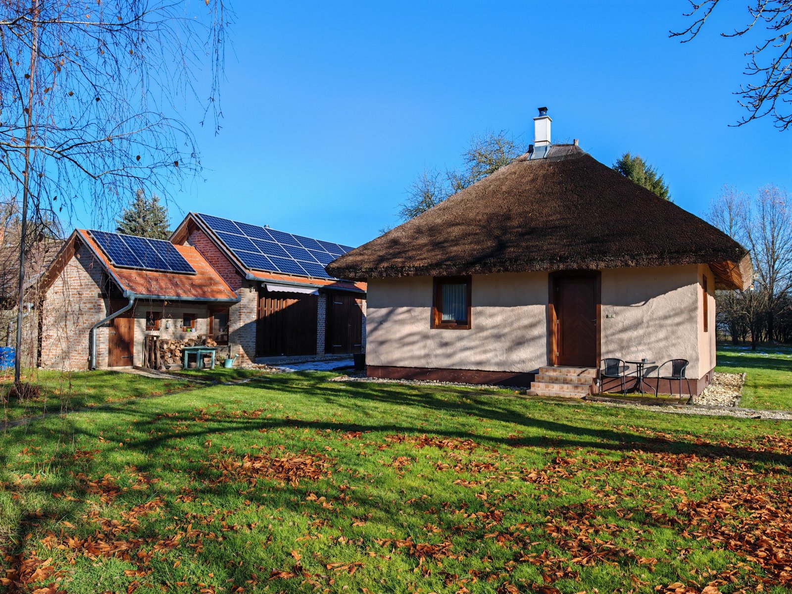 Het complex omvat ook twee rietgedekte huisjes met strobalen muren en een zorgvuldig gerestaureerde schuur met een traditionele koepelkachel. Elk huisje heeft twee slaapkamers, een moderne badkamer en een volledig uitgeruste keuken. De schuur dient als gemeenschappelijke ruimte en is een perfecte plek voor sociale bijeenkomsten en grotere evenementen.