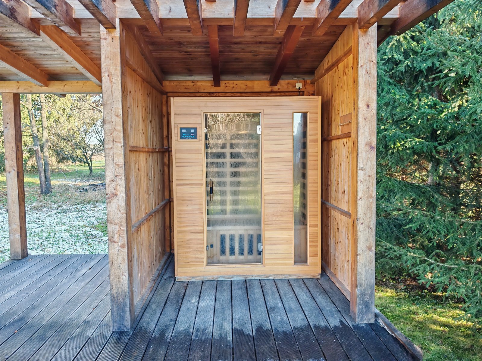 De tuin beschikt over een overdekt terras, ideaal voor barbecues en andere gezellige bijeenkomsten. Andere bijzondere kenmerken van het complex zijn een infraroodsauna en een houtgestookte hottub van 3 m³, die een ongeëvenaarde wellnesservaring bieden midden in de natuur. Deze voorzieningen combineren landelijke charme met moderne recreatiemogelijkheden.