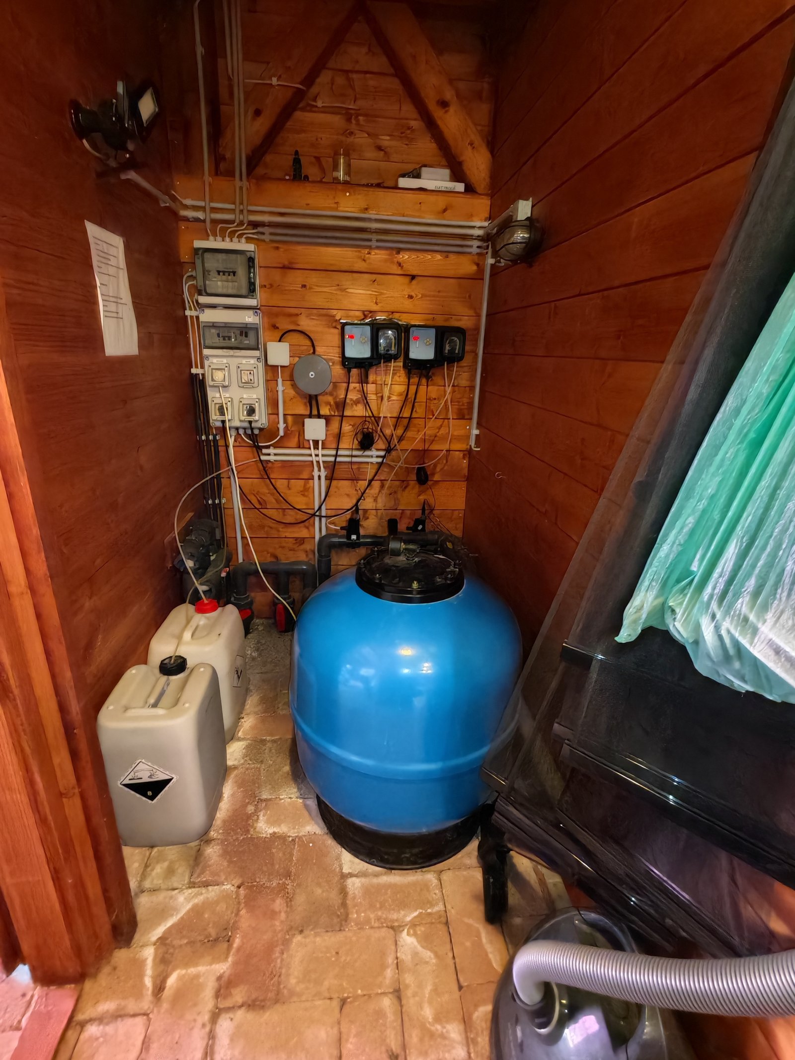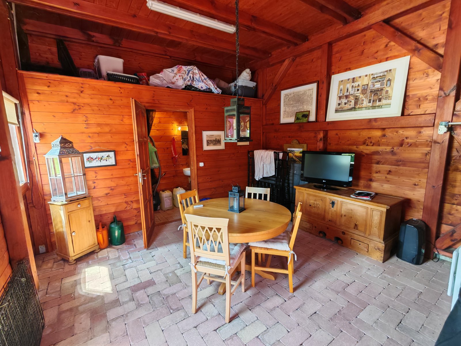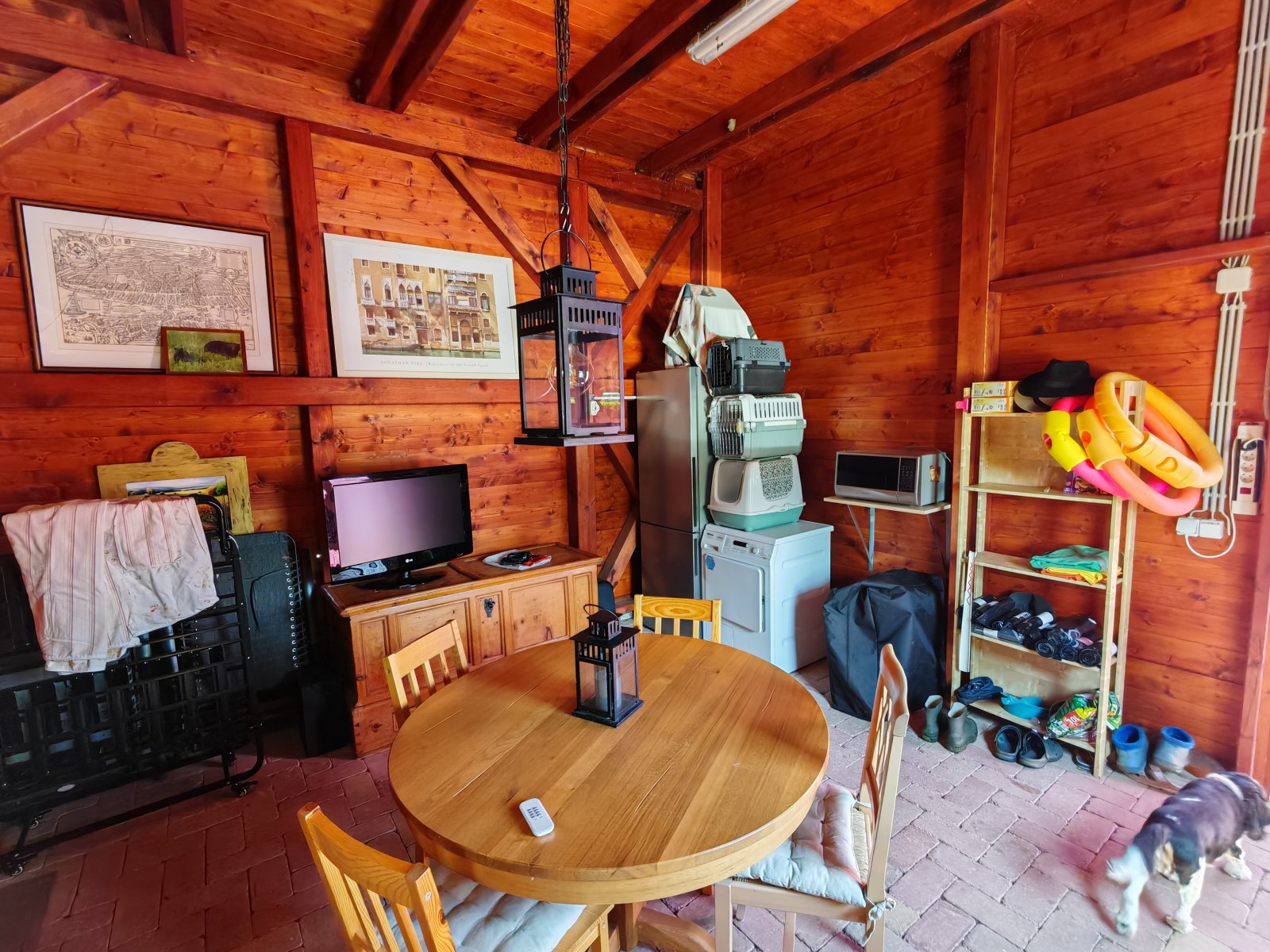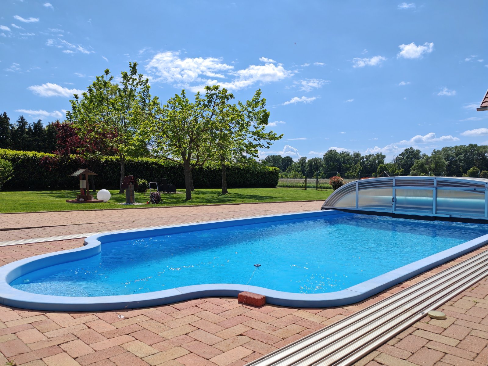 - Uitbouw met zwembadapparatuur, een gastentoilet en een recreatieruimte. Een volwaardig gastenverblijf zou hier met weinig moeite kunnen worden gerealiseerd. - Groot zwembad met overkapping