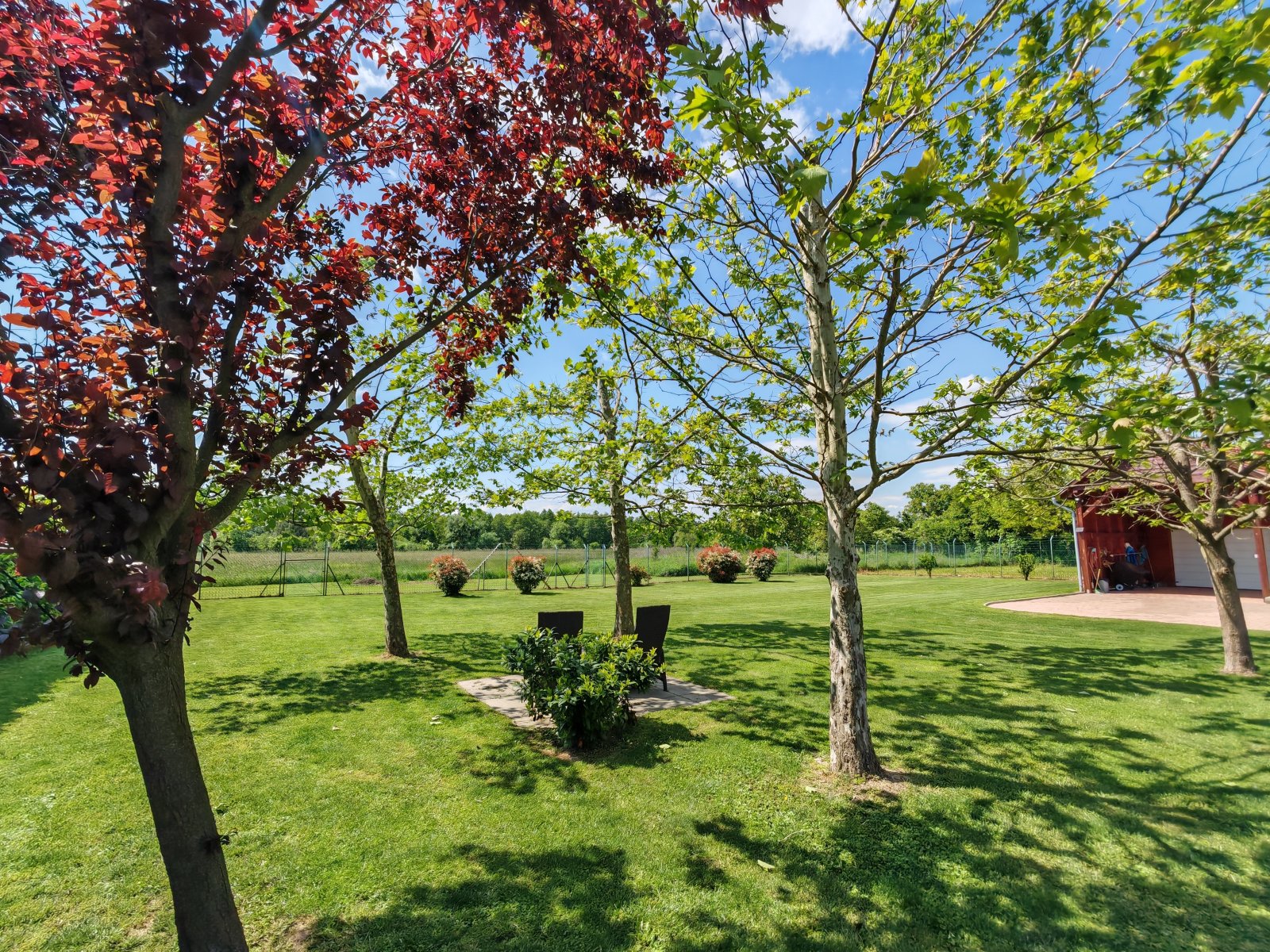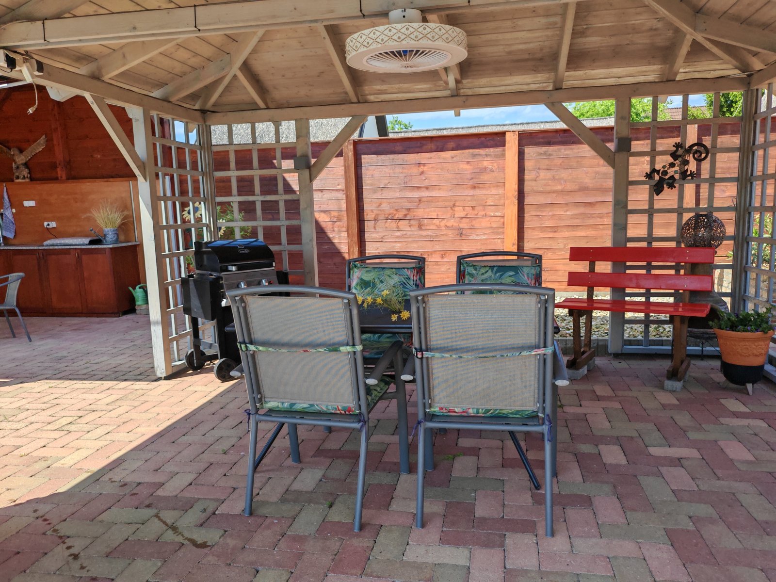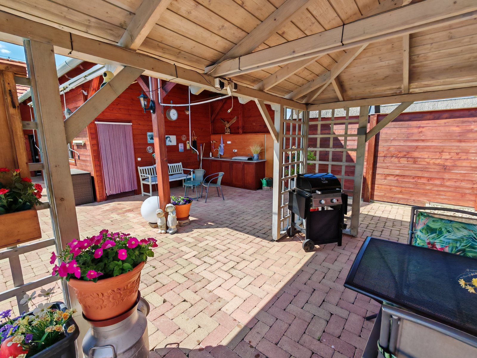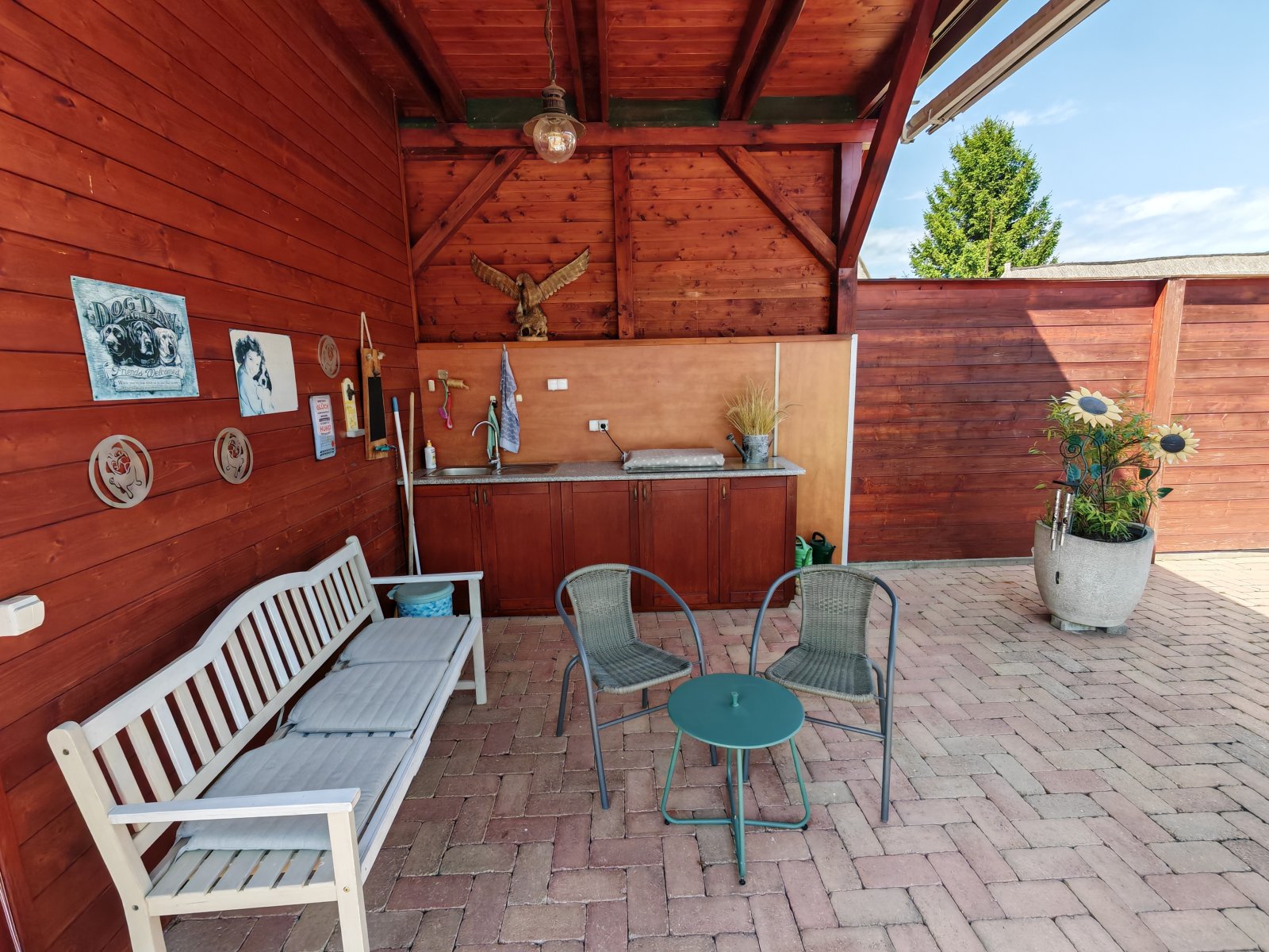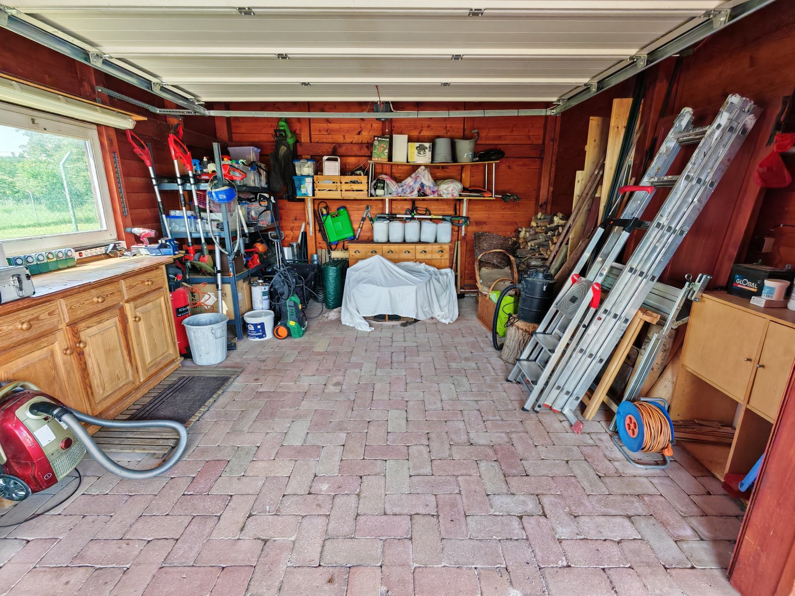 - Uitbouw met zwembadapparatuur, een gastentoilet en een recreatieruimte. Een volwaardig gastenverblijf zou hier met weinig moeite kunnen worden gerealiseerd. - Groot zwembad met overkapping