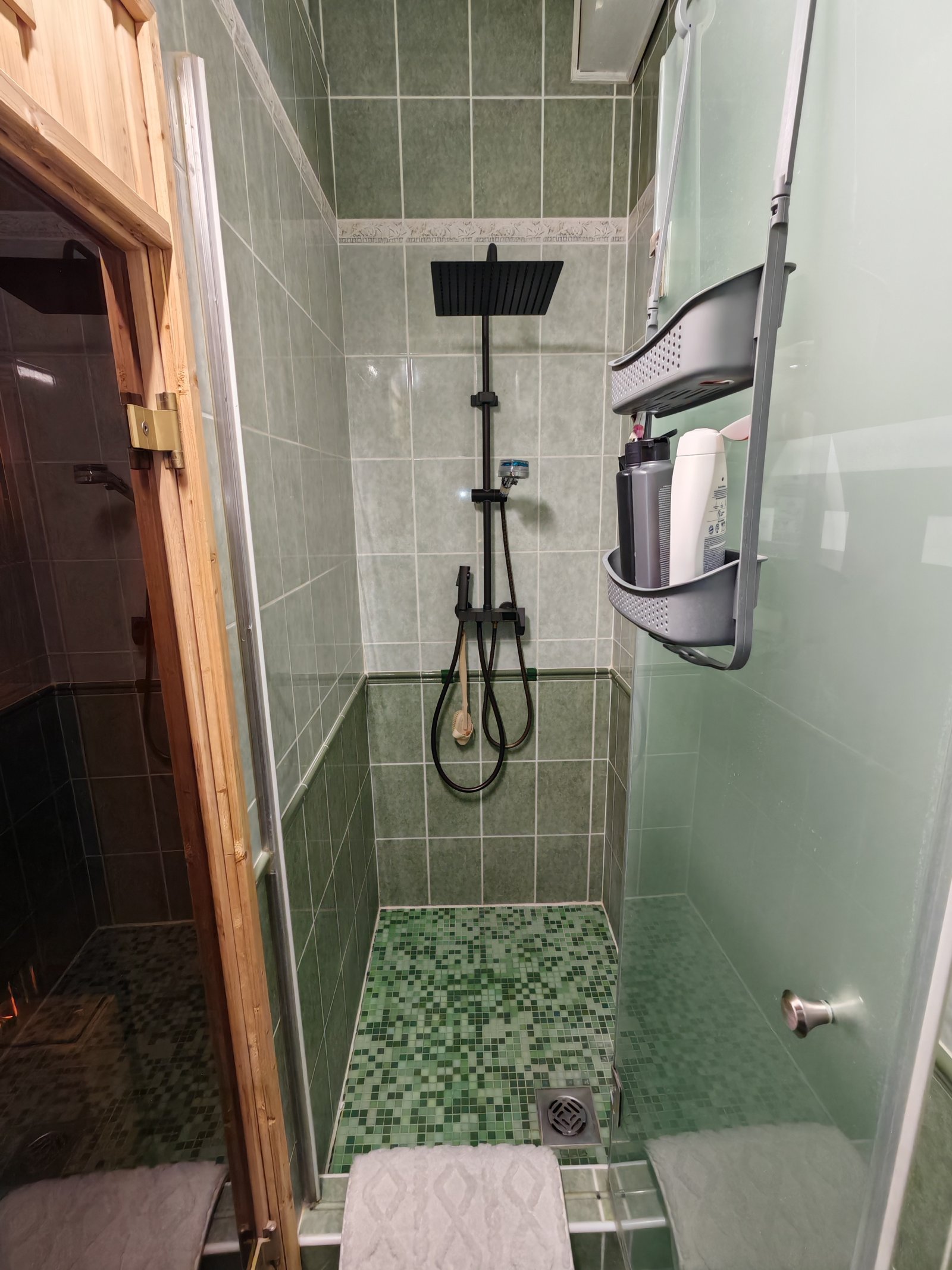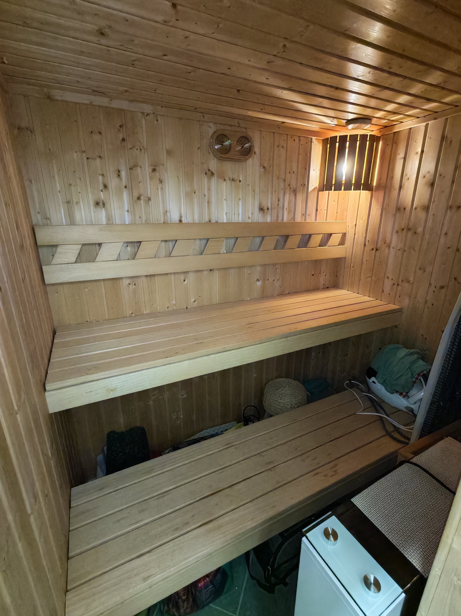 - Rechts daarvan bevindt zich de badkamer met douche/bad/sauna