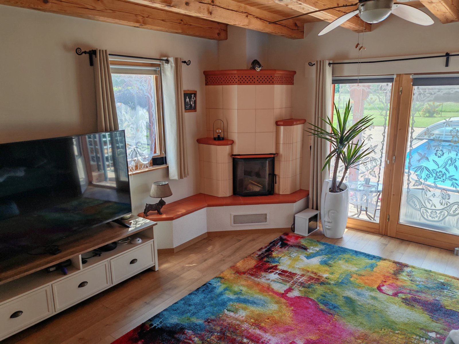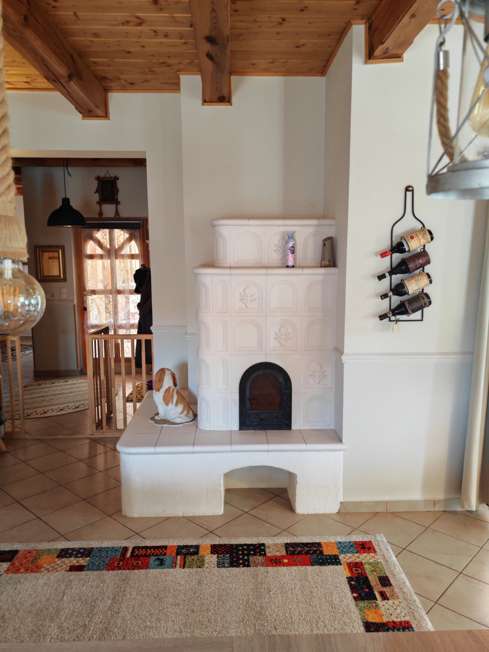 - En daarachter de woonkamer met wederom een indrukwekkende tegelkachel