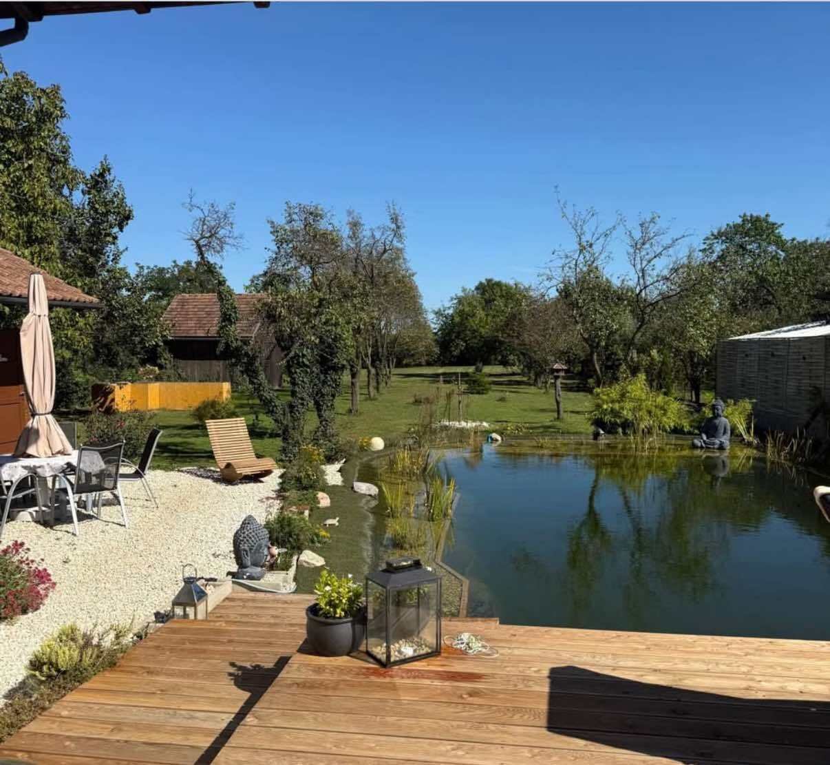 • Omheind, beschut terrein met een prachtig aangelegde tuin, fruitbomen en een groot natuurzwembad (12 x 6 m, helder, met biofilter)