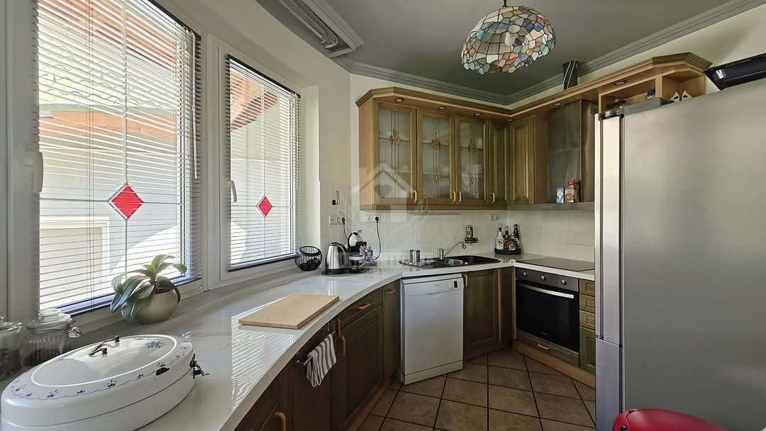 De woning heeft een woonoppervlakte van 155 m² en beschikt over een hal, drie slaapkamers, een studeerkamer, een woon-/eetkamer, een keuken, een bijkeuken, een badkamer, een toilet, een inloopkast en een bijkeuken. Daarnaast is er een garage van 45 m² met twee parkeerplaatsen en toegang tot de straat, een overdekt terras van 45 m² en een bijgebouw met twee kamers op de binnenplaats, waar zich ook een douche en toilet bevinden bij het zwembad in de tuin.