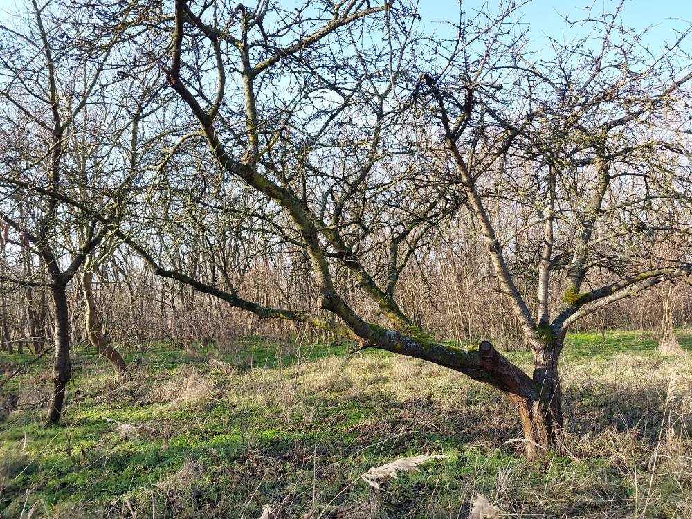 Het is grotendeels begroeid met gras en bevat twee kersenbomen en een walnotenboom. Het voorste deel van het perceel is vlak en loopt vervolgens af naar het zuidwesten.